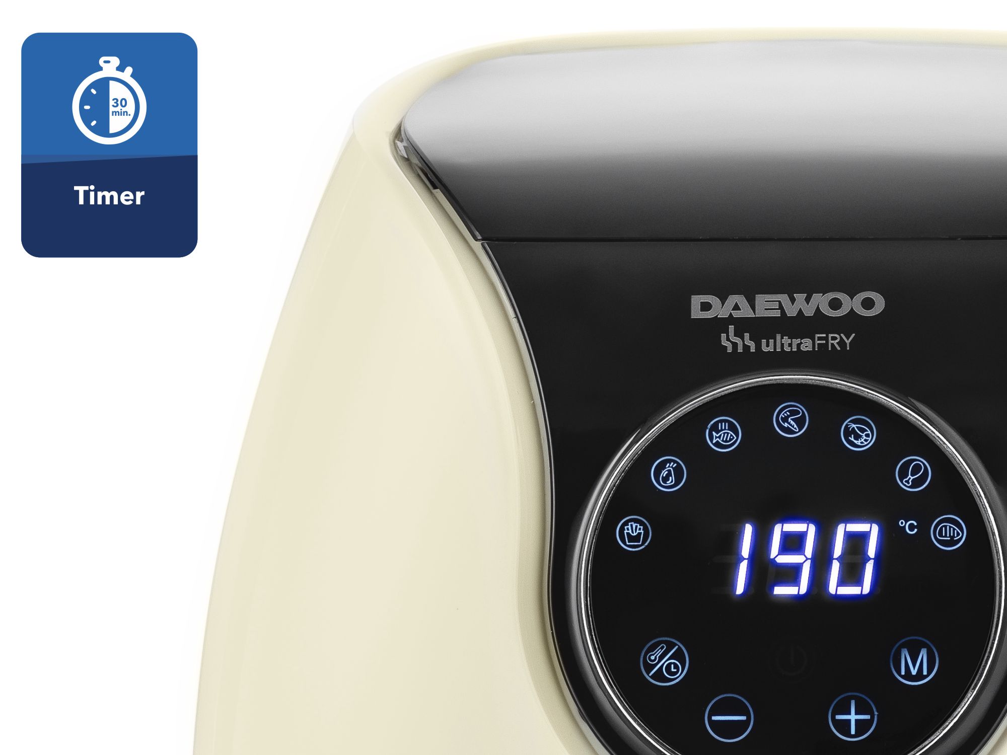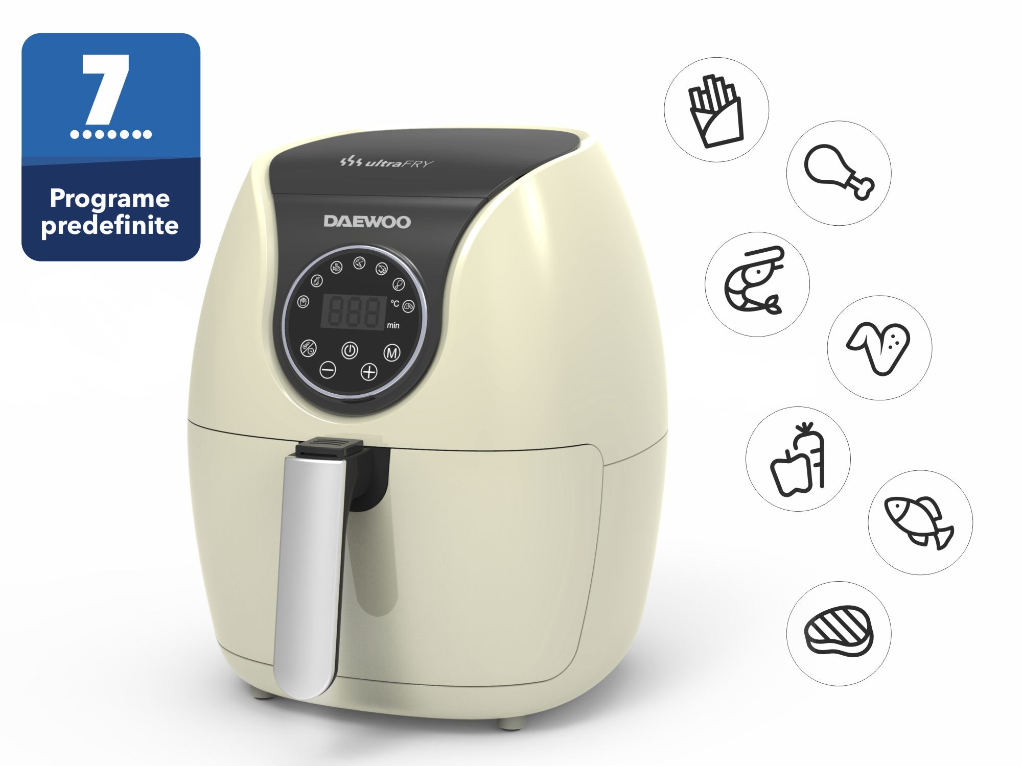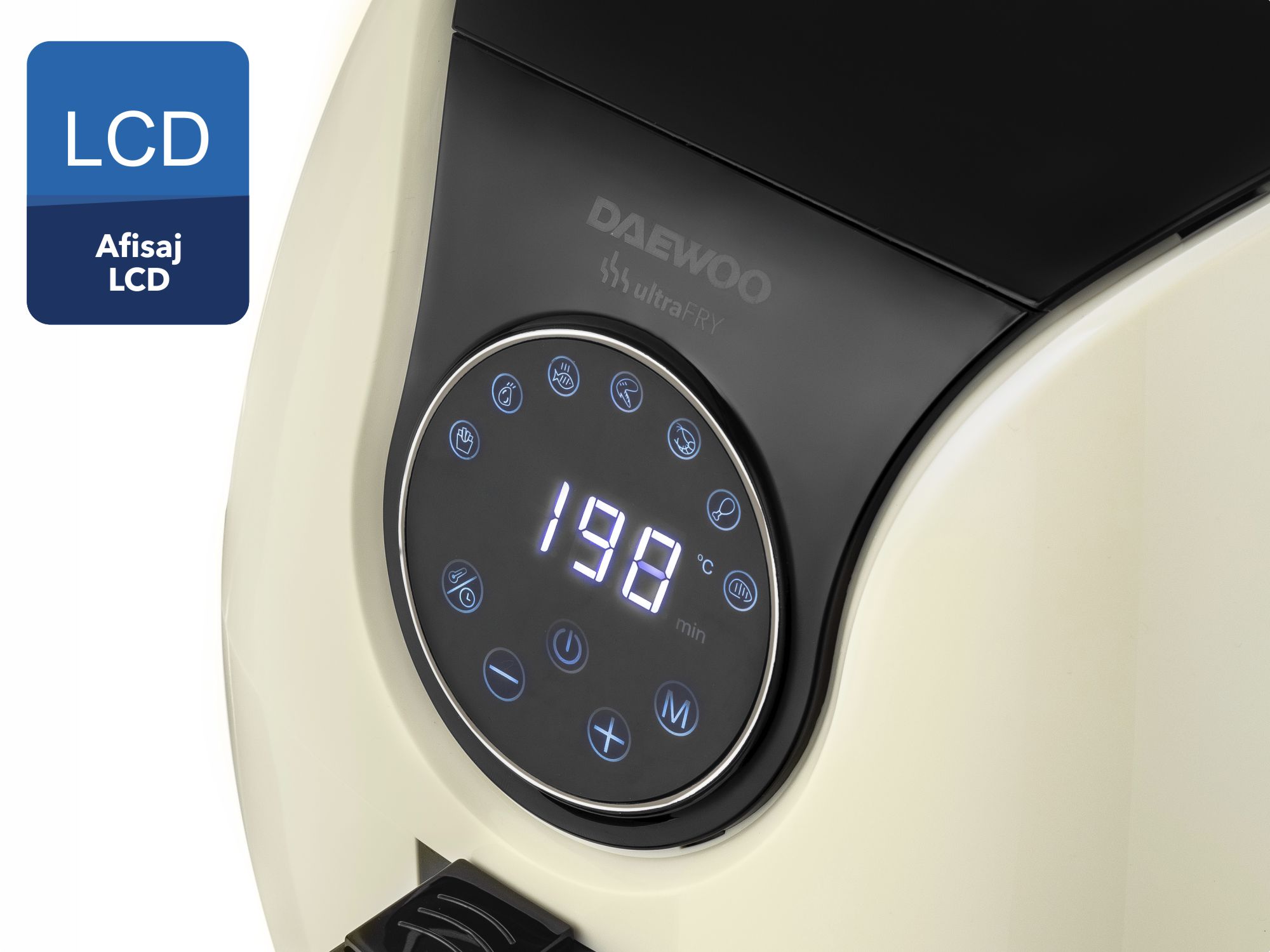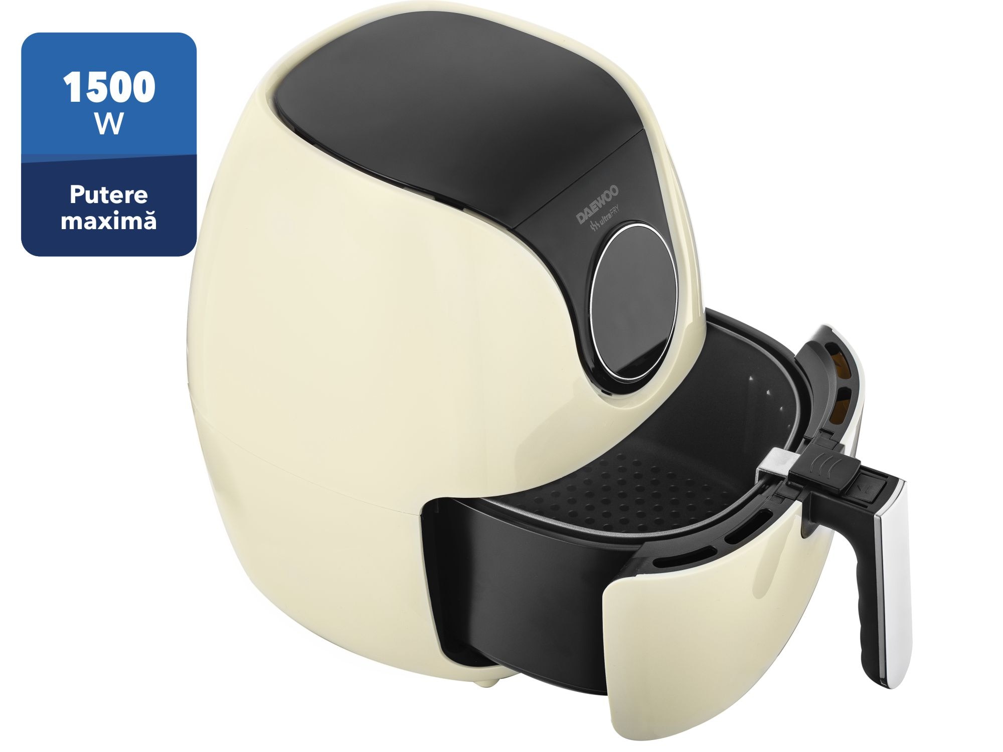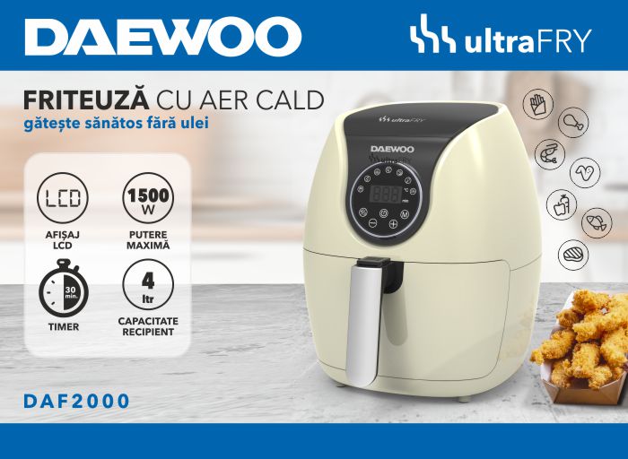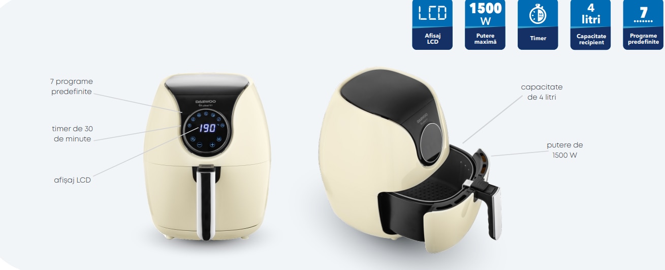 Friteuza cu aer cald Daewoo DAF2000, putere maxima 1500 W, display LCD, capacitate 4 litri, timer 30 minute, 12 programe predefinite, temperatura reglabila 80-200 grade Celsius, cos cu maner, tava pentru firimituri, bej
