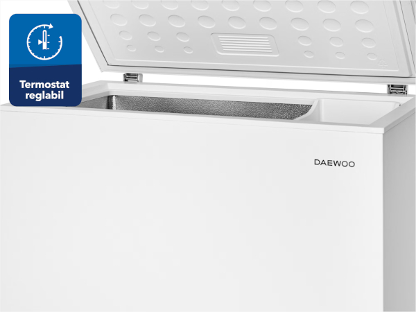 Lada frigorifica Daewoo dispune de termostat reglabil, ideal pentru monitorizarea usoara a temperaturii curente din interiorul congelatorului Daewoo. Regleaza si seteaza temperatura dorita folosind panoul de control si mentine temperatura precisa in interiorul aparatului frigorific, astfel incat alimentele depozitate sa fie pastrate in siguranta.