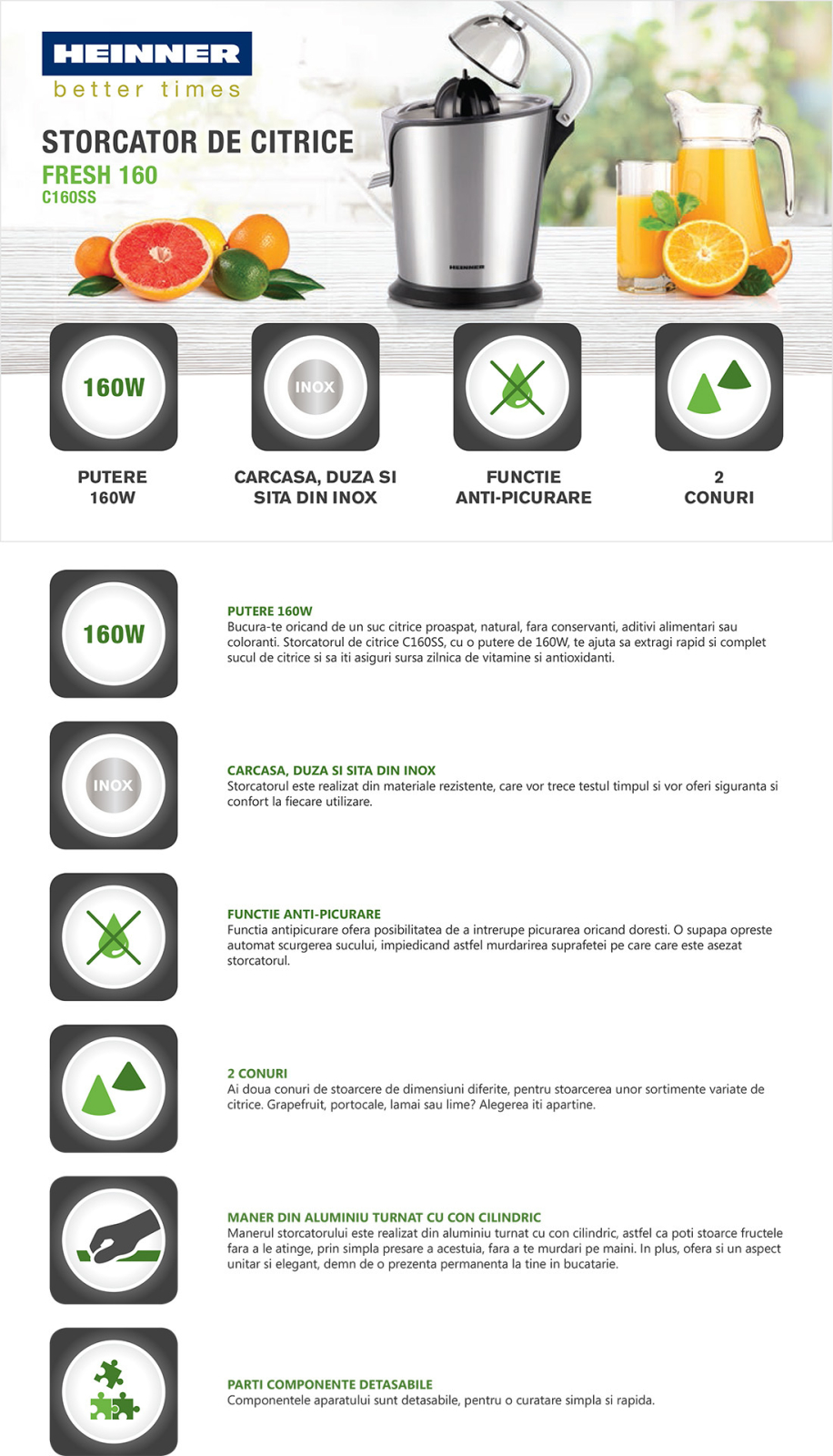 Storcator de citrice Heinner C160SS, putere: 160W, carcasa din inox, duza si sita din inox, functie anti-picurare, maner din aluminiu turnat cu con cilindric, parti componente detasabile, nivel de zgomot: 75dB.