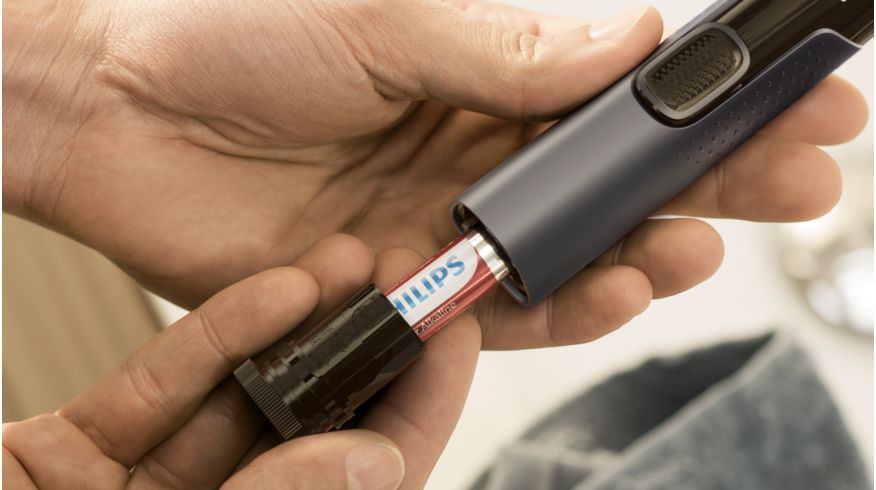 Baterie AA inclusa in pachet Acest aparat de tuns functioneaza cu o baterie AA care este inclusa in cutie; asadar, aparatul tau de tuns este imediat gata de utilizare. Pentru a schimba bateria, deschide dispozitivul rotind usor partea inferioara spre stanga. Trage partea inferioara spre tine, pentru a accesa compartimentul pentru baterii. |